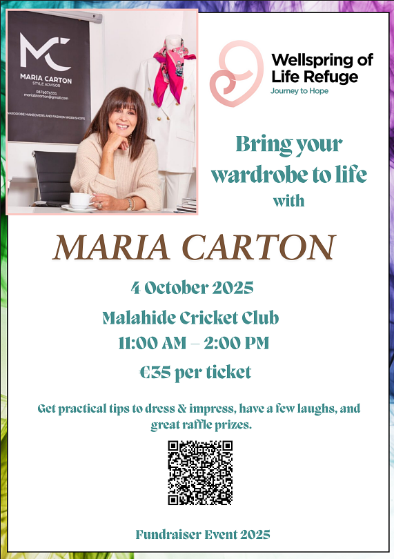 Malahide Cricket Club is delighted to support The Wellspring of Life Refuge by promoting this special event: a Fashion Masterclass with Maria Carton, on 4th October 2025, from 11:00 am to 2:00 pm.
