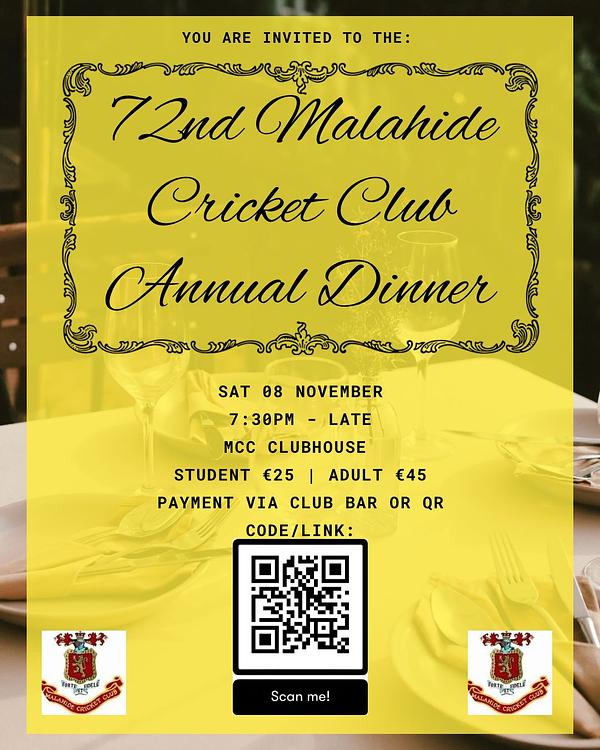 We are delighted to announce that the 72nd Annual Club Dinner will be taking place on Saturday, November 8th at 7:30pm in the Malahide Cricket Club clubhouse. This is a wonderful evening to come together to celebrate another great year of cricket in The Village!